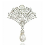 Art Deco Lab Grown Diamond Fan Brooch with Pearl Drop in Platinum, Vintage Luxury Collectible Jewelry