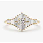 Round and Baguette Cut Lab Grown Diamond Cluster Ring in 18K Yellow Gold, Art Deco Engagement Ring
