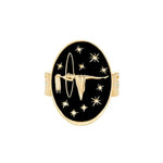 Yellow Gold Black Enamel Celestial Ring with Lab Grown Diamond Stars & Aerial Hoop Motif, Artistic Ring