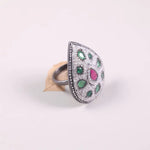 Antique Victorian Style Ruby and Emerald Gemstone Ring – Pear Shape 925 Sterling Silver Ring with Natural Diamond, Elegant Gift for Her