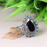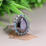 Art Deco Style Statement Ring – Pear Shaped Black Onyx with Blue Topaz Halo | Sterling Silver Cocktail Jewelry, Unique Engagement Gift