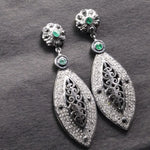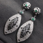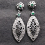 Victorian Style Dangle Earrings – Emerald & Black Diamond Accent Silver Filigree Statement Jewelry Gift