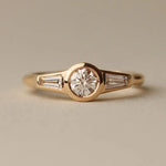 1.50 Ct Round Lab Grown Engagement Ring with Tapered Baguette Side Stones in Yellow Gold, Vintage Style