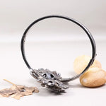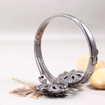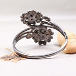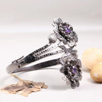 Vintage 1980s Floral Silver Cuff Bracelet – 925 Sterling Silver Handmade Double Flower Design with Purple Gemstone, Elegant Antique Jewelry